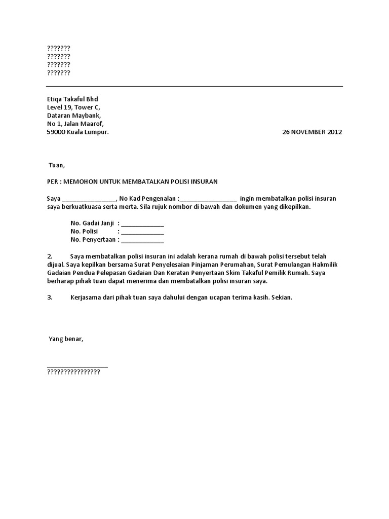 Contoh Surat Pembatalan Polisi Insurans Relj81930741